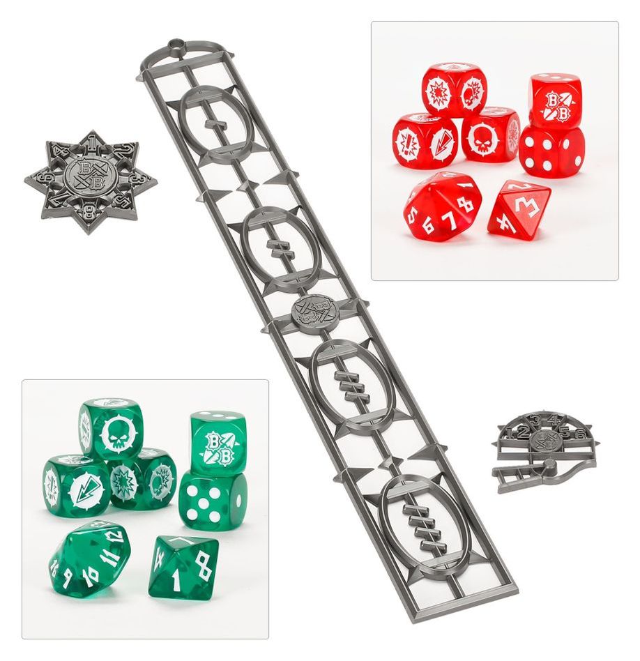 – 2 full sets of Blood Bowl dice: one in red for the Humans, and the other in green for the Orcs