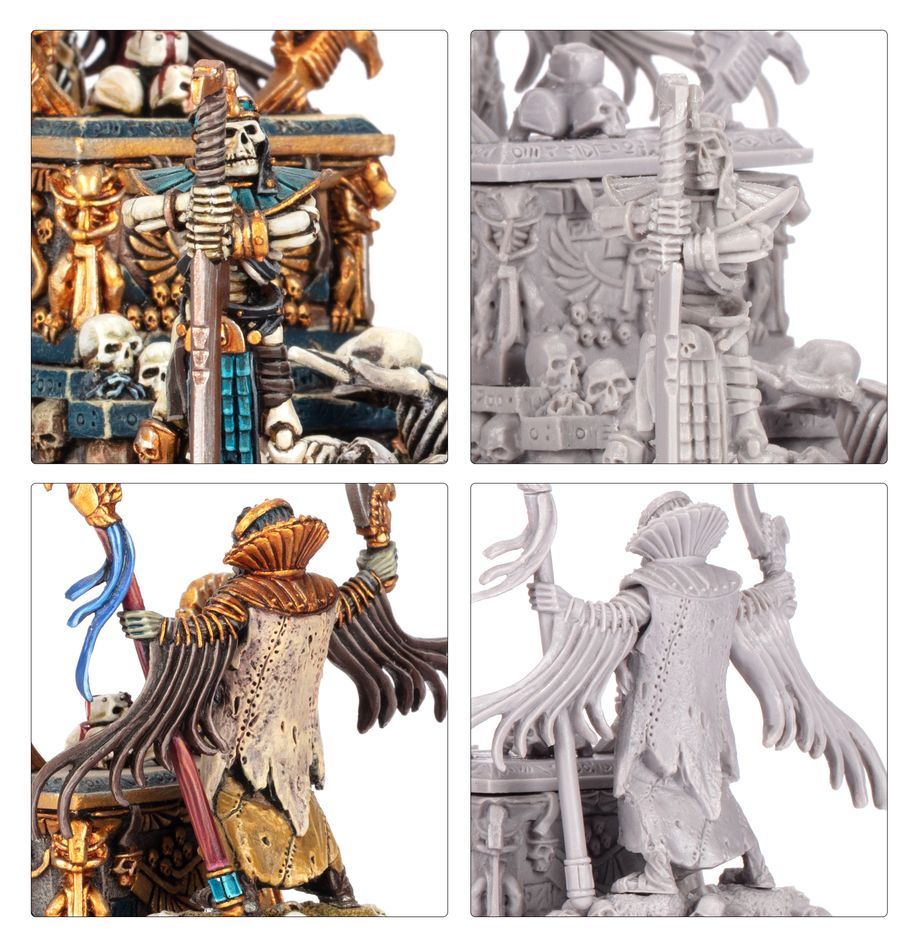 This multipart resin kit builds a Casket of Souls, an accursed testament to the wrath of the Tomb Kings of Khemri. A Liche Priest stands before an ornate sarcophagus on a raised dais, guarded by two Casket Guardians armed with sweeping great weapons. This ancient relic radiates deathly magic, further empowering the terrible rituals of the Mortuary Cults. Its interior is fully sculpted, allowing you to remove the casket's lid to reveal the tormented souls within.