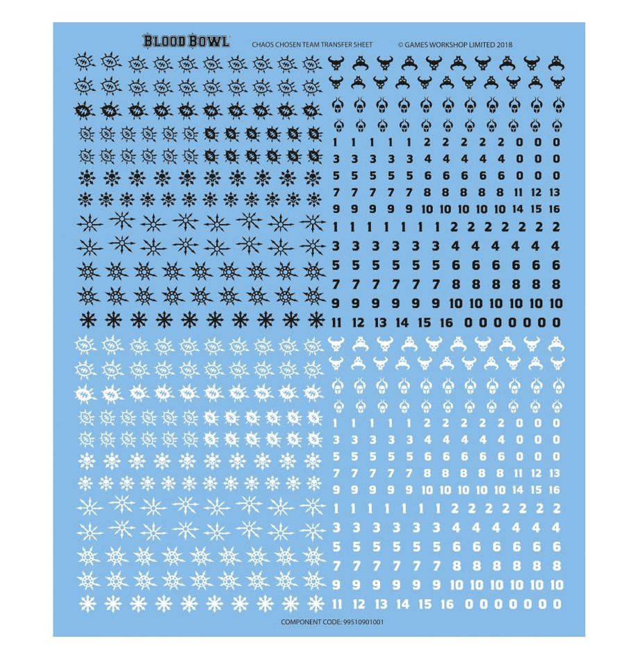 There are a host of extras in the kit – 2 turn markers, 2 double-sided score coins in the shape of Chaos stars and 6 balls – 2 each of a flaming ball, a skull ball and another skull ball, these lacking pegs. Supplied with 12 32mm Blood Bowl bases, a 1,000,000 GP roster and an Chaos transfer sheet.