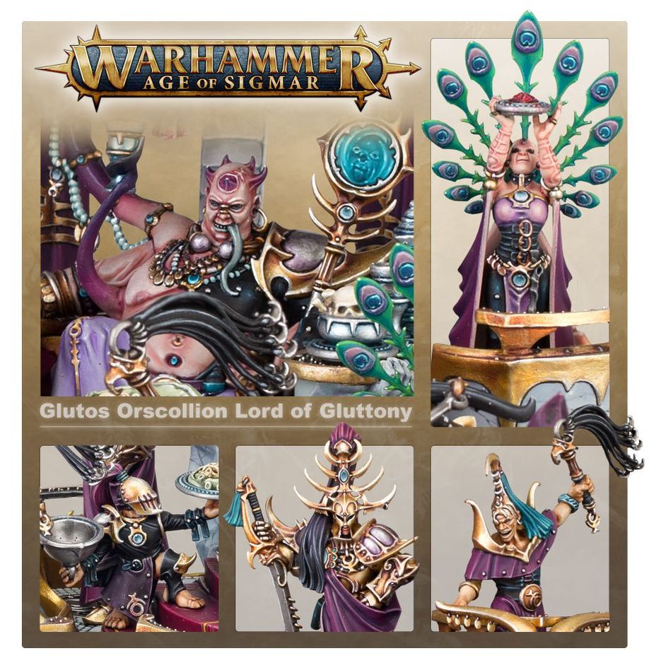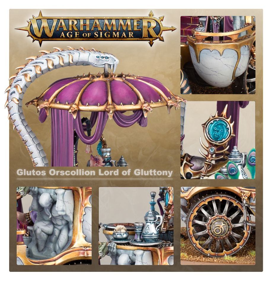 Guided by the Daemon Loth'shar, Glutos Orscollion is on a quest to sample the most exotic tastes in the Mortal Realms. Riding atop an opulent palanquin and surrounded by his devoted court, he can unmake whole armies through his loathsome magics.