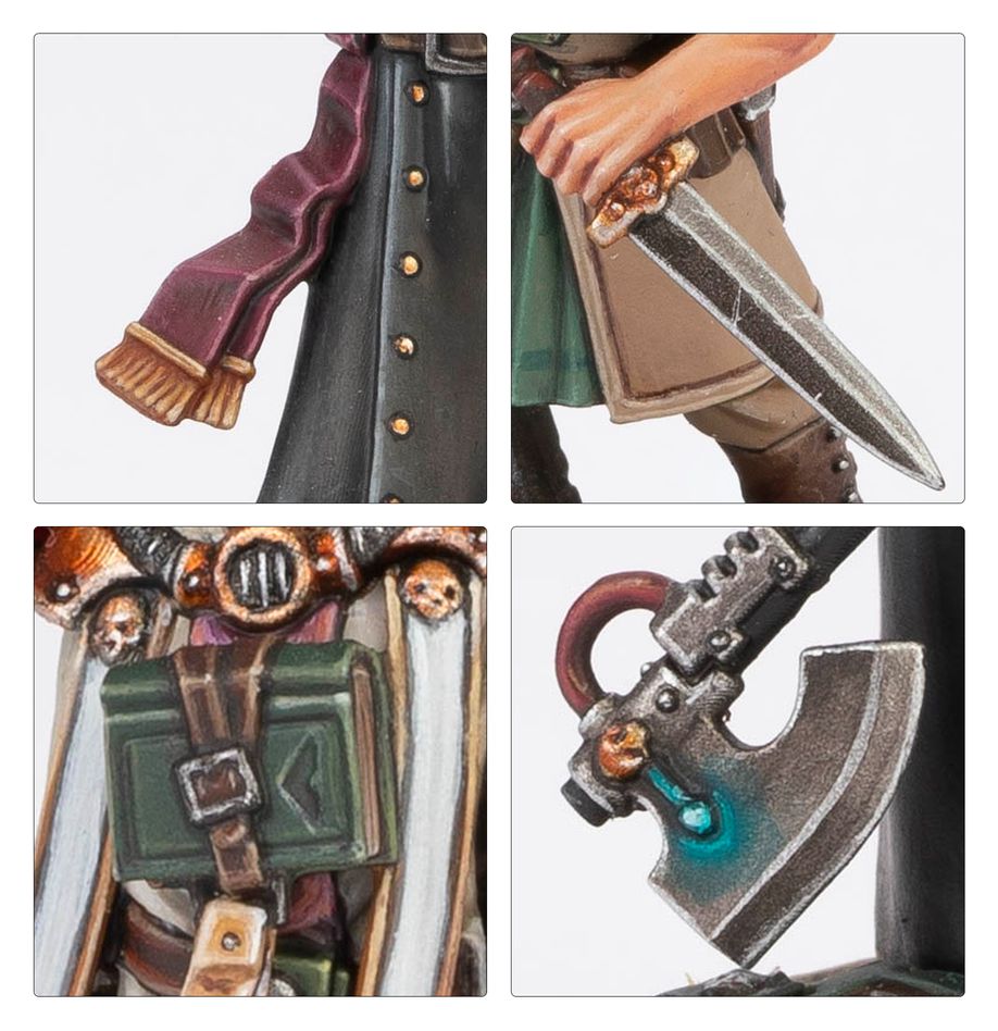 This multipart plastic kit builds the legendary Captain Minka Lesk, as well as her companions, for your Astra Militarum armies in games of Warhammer 40,000. Her cadre has come straight from the pages of her Black Library novels and includes Confessor Talbeas holding the regimental standard, veteran Trooper Jaromir toting his signature melta rifle, the sinister Commissar Shand, and the stealthy Veteran Sergeant Grawnya. Take them to the tabletop and find new ways to grow their epic saga.