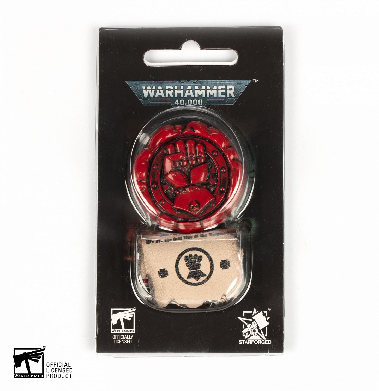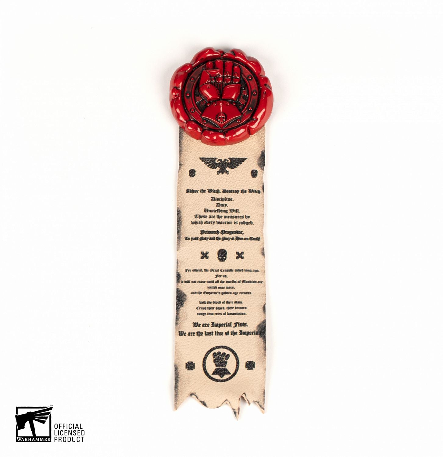 This full-size decorative purity seal is made of metal with a bonded red finish, measuring roughly 42mm in diameter, and pressed with the clenched fist icon of the Imperial Fists. The parchment, made of sheep’s leather, is about 42mm wide, and 143mm length, decorated with litanies and imagery associated with the sons of Rogal Dorn.