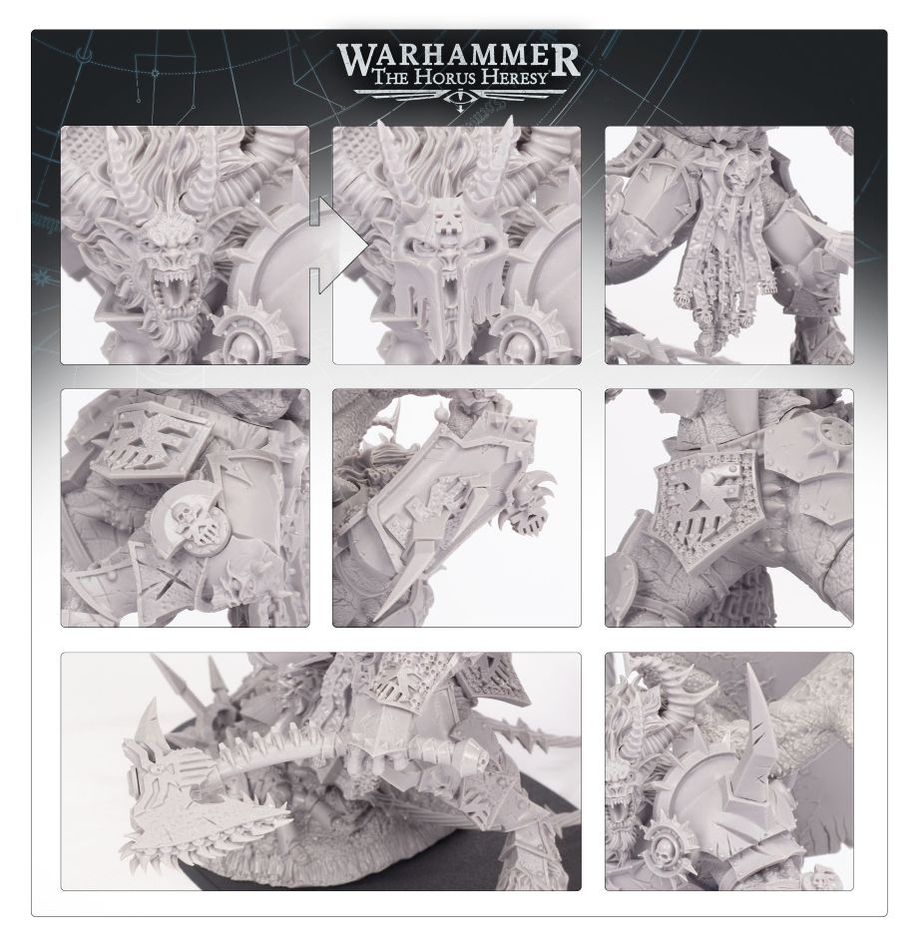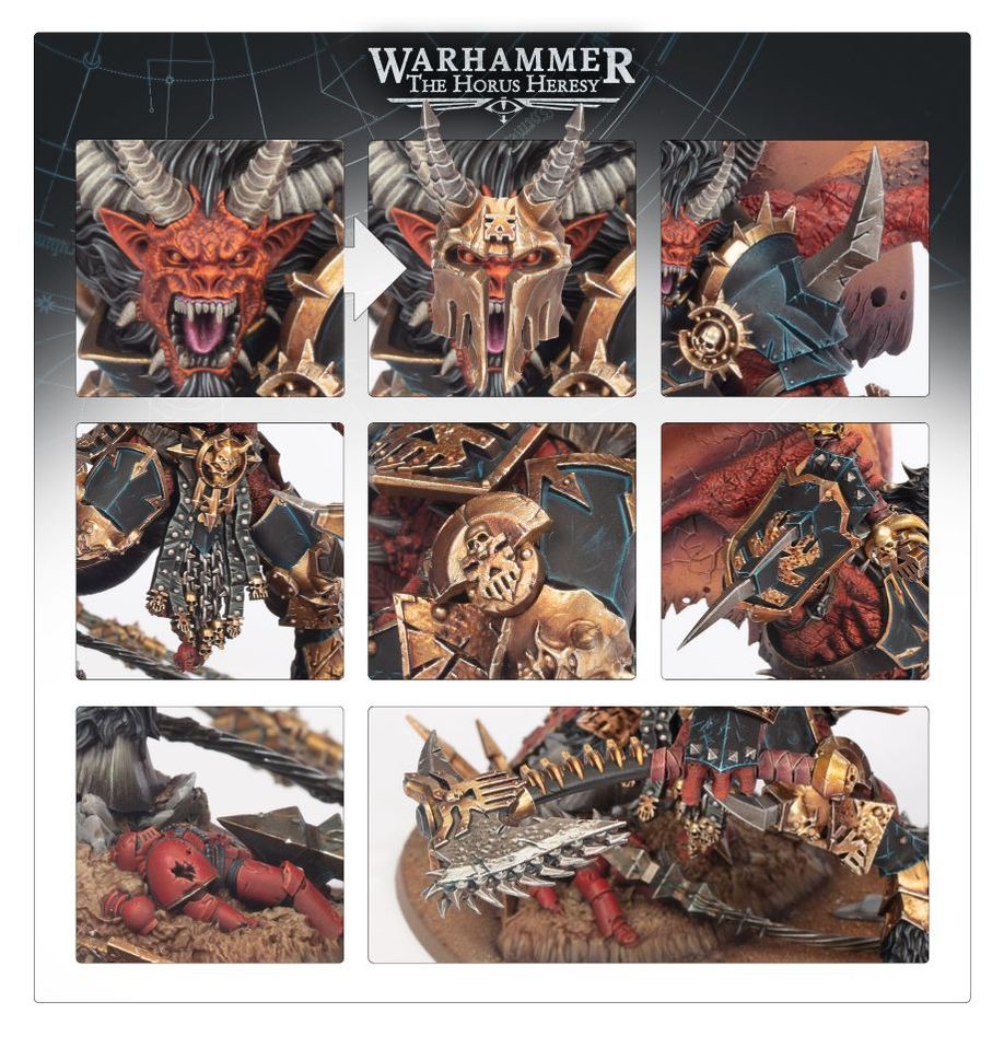 Arch-enemy of the IXth Legion, Ka'bandha is one of the most ferocious daemons ever encountered by humanity. Armed with an ornate daemonic axe and whip, he cut a bloody swathe through the sons of Sanguinius. From his hellish visage to his brutal bronze armour and vast wings, Ka'bandha is a paragon of atavistic fury – and a wonderful project for painters who want to create a stunning centrepiece for their Warhammer: The Horus Heresy forces. He can be assembled with a daemonic helm or a bare, snarling head. Underneath one of his mighty hooves sits a pile of rubble alongside an Astartes corpse, and a ruined Leviathan Dreadnought belonging to the Blood Angels Legion.