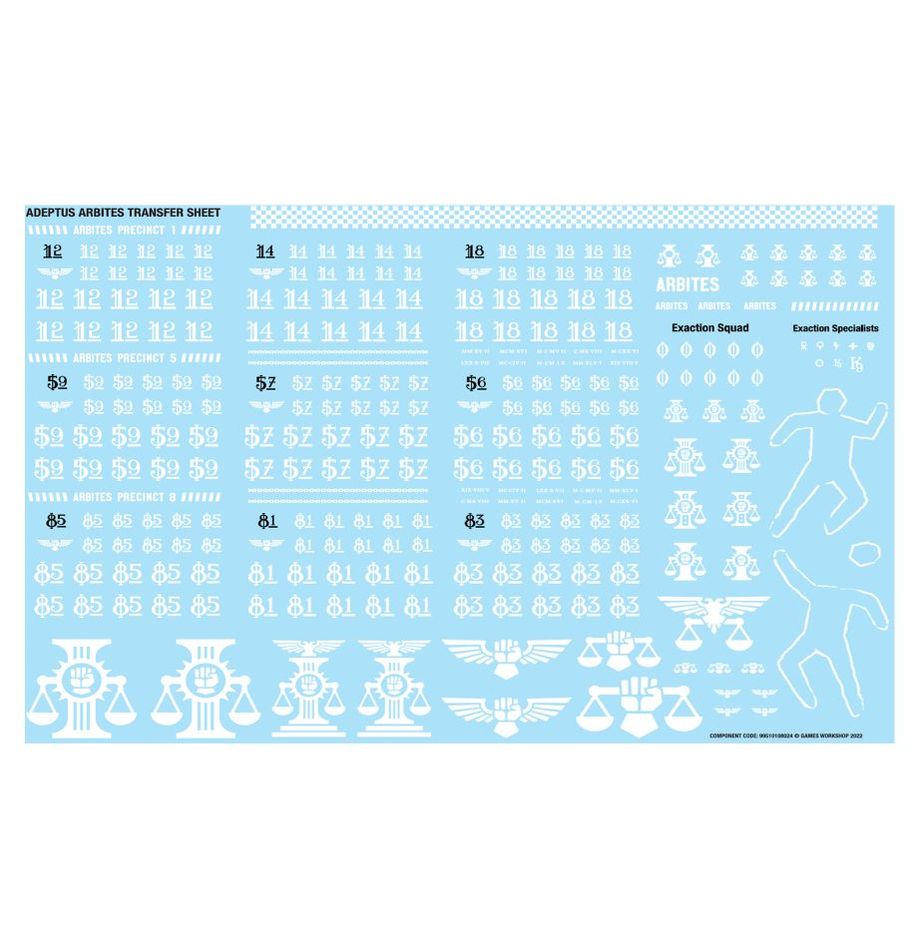 This kit contains 203 plastic components, and comes with 10x Citadel 28.5mm Round Bases and 2x Citadel 25mm Round Bases. This set also includes 1x Adeptus Arbites Transfer Sheet containing 297x high-quality waterslide transfers for you to use to decorate your models.