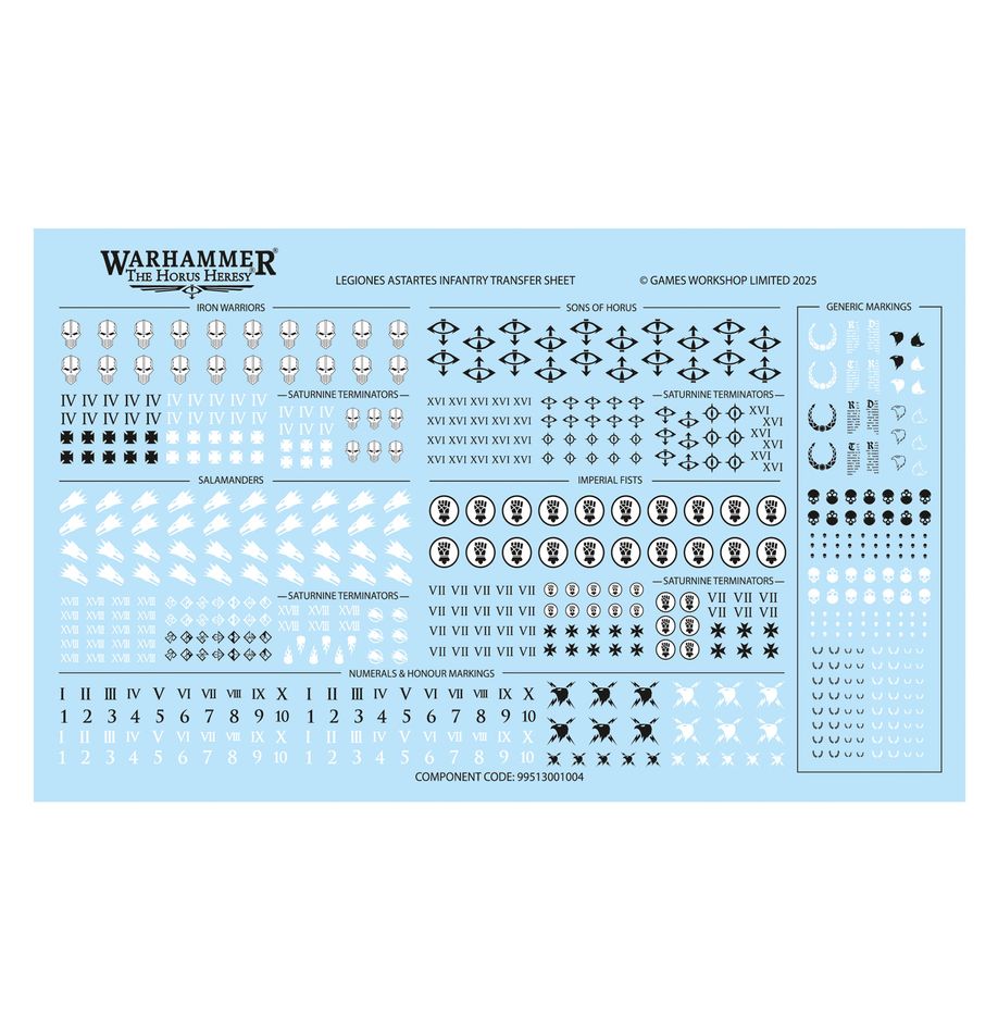 This kit comprises 344 plastic components, 20x Citadel 32mm Round Bases, and 1x Horus Heresy Legion Infantry Transfer Sheet containing 618 high-quality waterslide transfers – featuring Legion iconography for the Sons of Horus, Imperial Fists, Iron Warriors, and Salamanders – to decorate your miniatures.