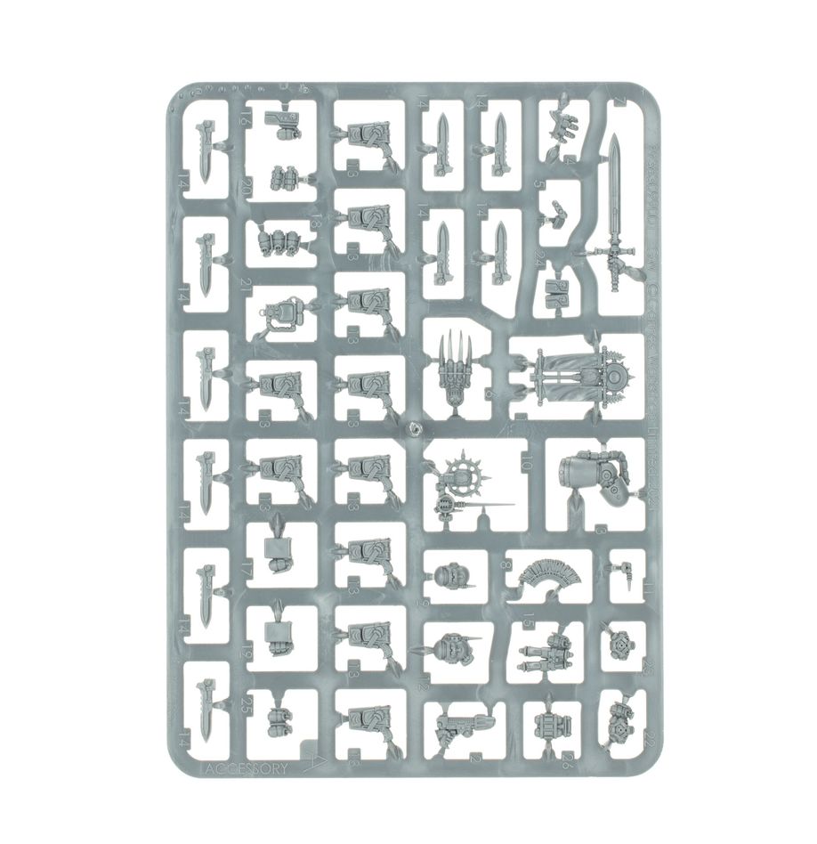 This kit can build one large unit, or two smaller units of 10, each with its own optional Sergeant, Legionary with nuncio-vox, and Legionary with vexilla. The Sergeant has a choice of three heads – two bare, and one helmeted with a transverse crest. He can be armed with a bolter or a plasma pistol, and a power sword, power fist, or lightning claw. He can also take an optional melta bomb. The Legionaries with bolters can take an optional bayonet or chain bayonet, and the heads and accessories – including grenades, pistol holsters, and pouches – are interchangeable across the miniatures.