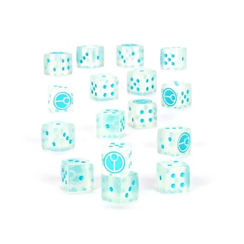 A set of 16 six-sided dice for games of Warhammer 40,000, themed around the T'au Empire. These dice are cast in a crisp frosted white, with pale blue markings. The 1-5 facings are traditionally pipped, but each '6' facing is instead decorated with the rounded T'au Empire icon.