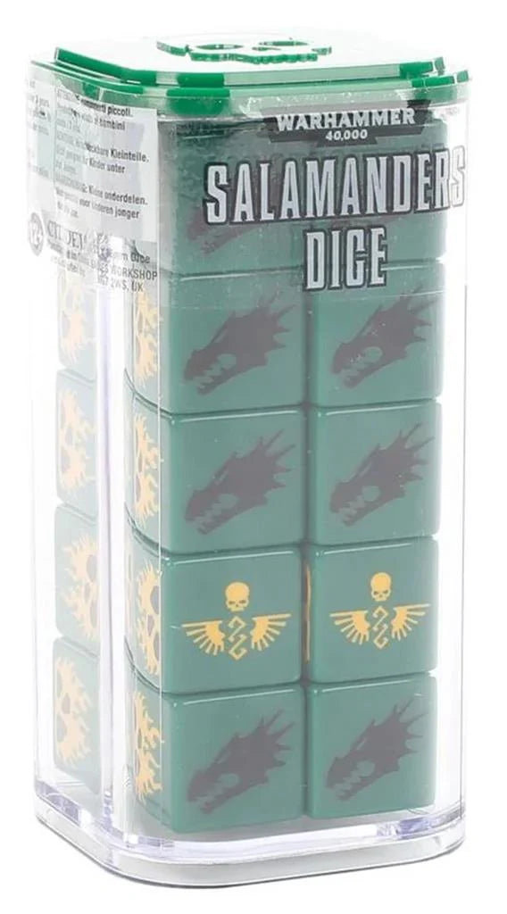 Cada cubo de seis lados con esquinas redondeadas es verde con caracteres blancos. Los 20 cubos de este juego miden 16 mm por 16 mm cada uno. Cada uno está blasonado con el símbolo de las Salamandras en el lado del 6, el símbolo del apothecarii de los Marines Espaciales (el Helix Primus) en el lado del 1 y los puntos tradicionales en los lados del 2-5 por pequeños carbones brillantes de color naranja y Negro reemplazado. Los cubos están en un recipiente de plástico transparente.